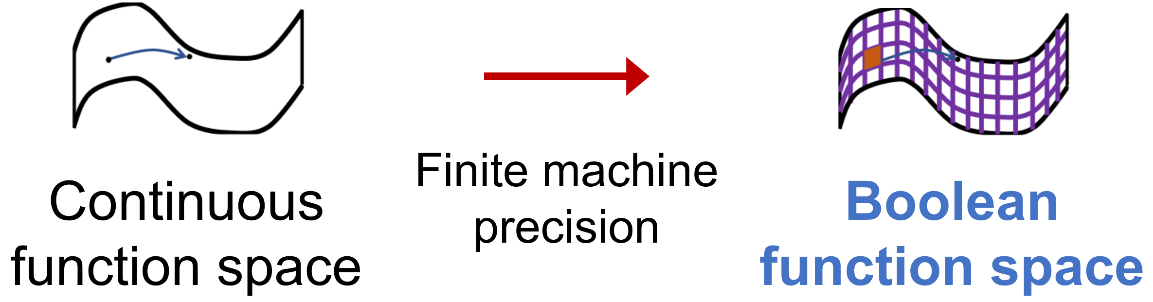 This Boolean modeling makes the analysis tractable because parity functions form a basis for Boolean function space; a function’s complexity can be defined via its expansion over this basis. For general continuous-function spaces, such a universally convenient basis does not exist, making "fair" complexity comparison much harder.