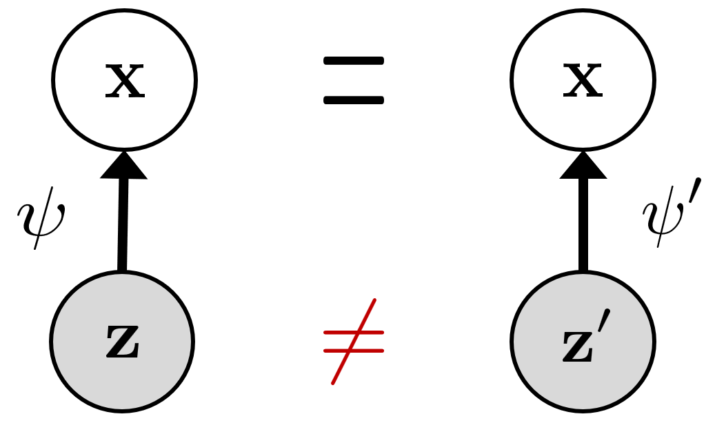 Unfortunately, identifiability typically requires additional assumptions. In fact, it is known that without restrictions on the structure of \(\mathbf{z}\) or the form of \(\psi\), \(\mathbf{z}\) is generally not identifiable [6]. The reason is that the same observed distribution can correspond to infinitely many essentially different pairs (latent variables, generative functions), and we have no way to tell which one is the true generative model.